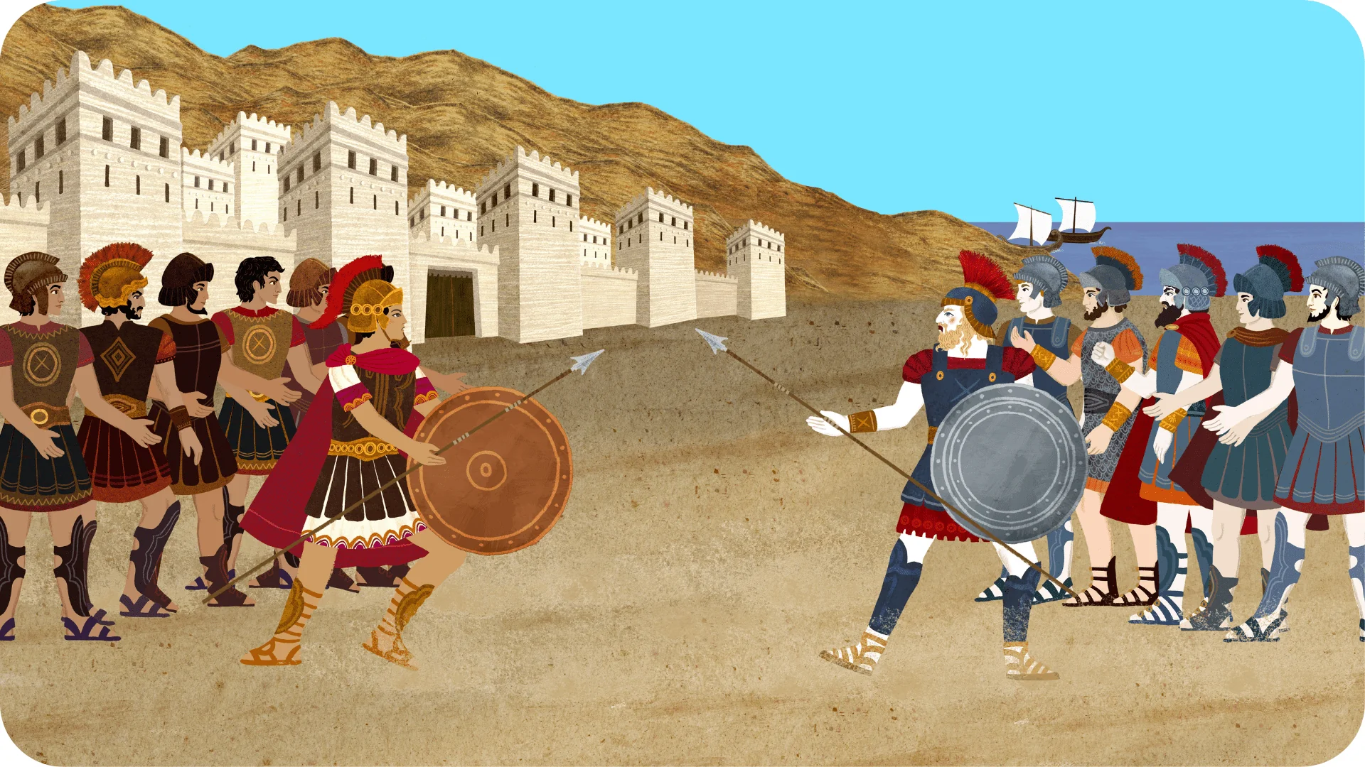 « Chante, Déesse, la colère d’Achille… » - c’est ainsi que commence l’Iliade, dont le véritable sujet n’est pas la guerre mais l’évolution des émotions d’Achille. Cet épisode, centré sur les deux colères du héros qui passe de la rancœur à la rage avec la perte de son meilleur ami, est donc primordial dans le récit. Les enfants y découvriront deux autres scènes clés du texte d’Homère : le duel de Pâris et Ménélas et les adieux émouvants d’Hector à sa femme et son fils.